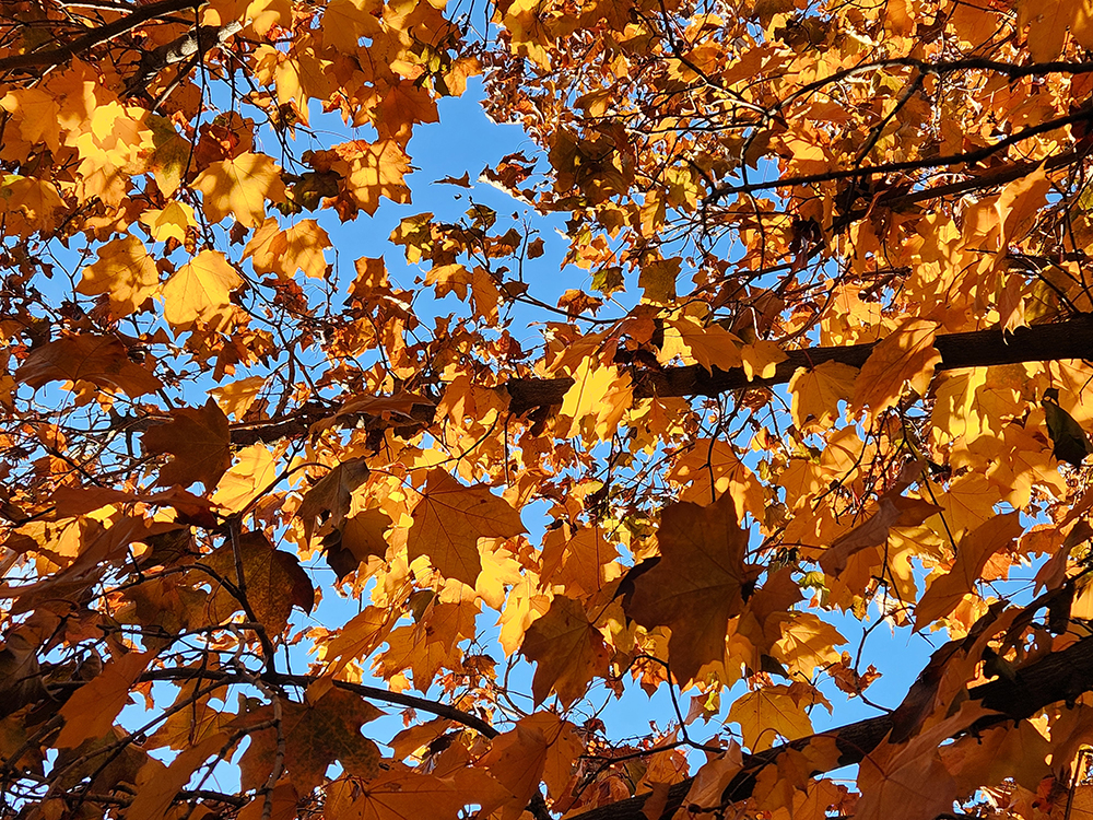 But not today. Today the fallen leaves are gorgeous and I have enough strength to get them moved from lawn to pile. I even take a moment to shuffle into the pile and lay down for a moment, feeling the prickle of the leaves as I stare up at the sky. It is wide and blue, full of bright contrast for the leaves that remain on the tree above me. Today there is beauty.